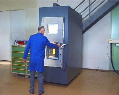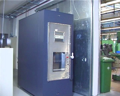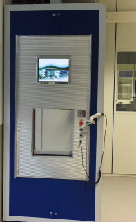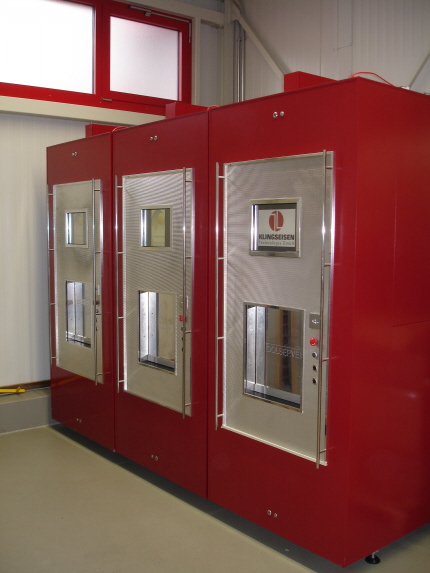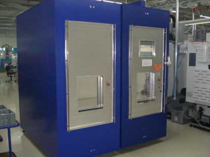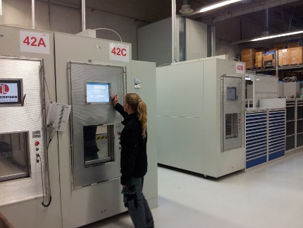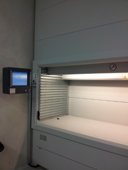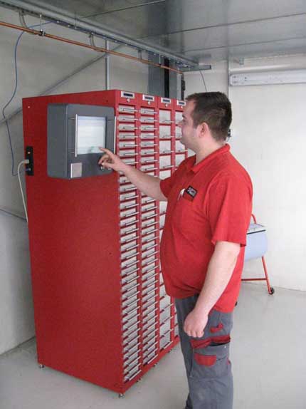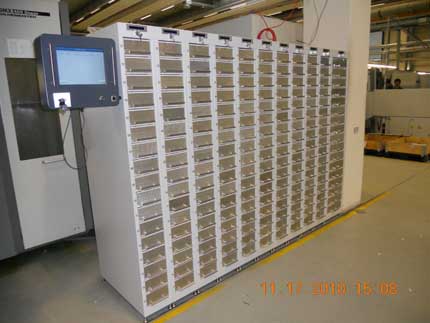 Luftfahrtzulieferer in Bayern. Zur Verwaltung von ca. 3000 Lehren wird eine Kombination aus TOOLSERVER und TSM eingesetzt. Kleine Lehren Lagern im TOOLSERVER während die sperrigen Teilen in TSM-Schubladen wegeschlossen werden. Bild zeigt TOOLSERVER mit Ein/Ausgabeschleuse