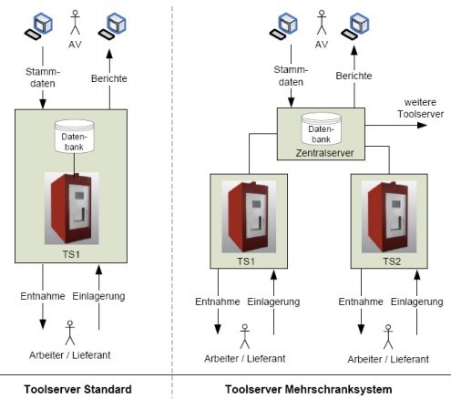 Die moderne Toolserver-Software steuert auch vorhandene Lagersysteme (z.Bsp KARDEX, MEGAMAT Lift/Shuttlesysteme). Der grosse Gewinn besteht darin, daß eine Vielzahl von Benutzeroberflächen (von Geräten unterschiedlicher Hersteller) auf nur eine reduziert werden kann, sowie ebenfalls nur eine Schnittstelle zum PPS-/ERP-System bedient werden muss. Dies spart dem Unternehmen enorme Kosten und führt gleichzeitig zu zufriedeneren Benutzern, die Ihre Ressourcen für Ihre eigentliche Aufgabe besser konzentrieren können.