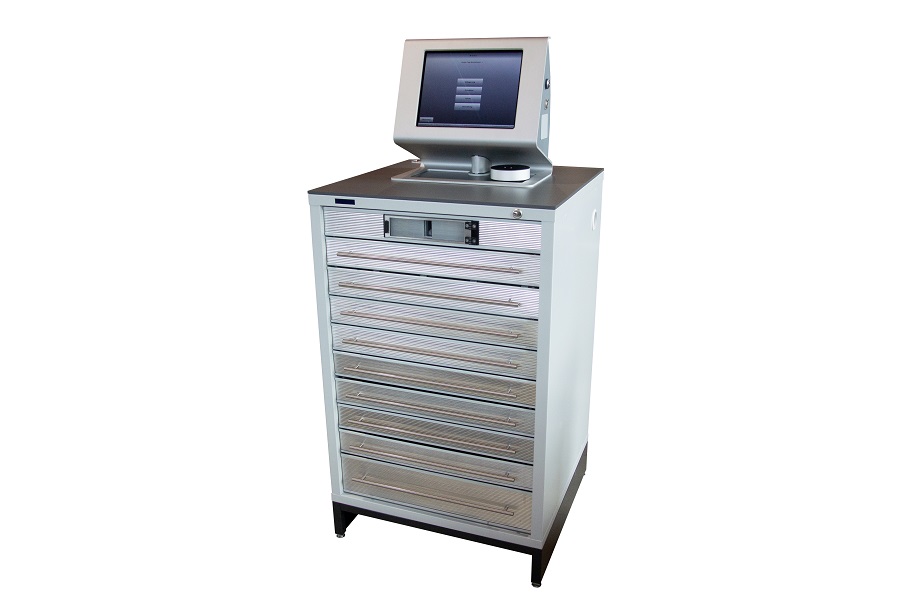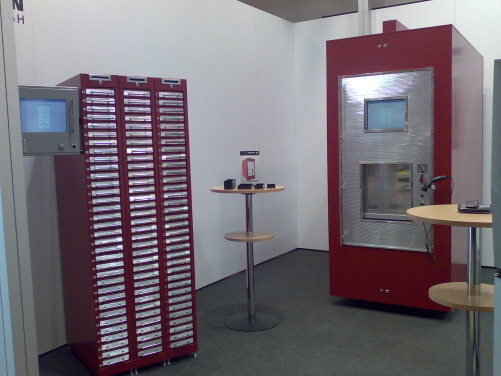 auf der Messe PRODEX in Basel präsentieren wir erstmals unsere neueste Entwicklung. Unsere bewährte, modulare Schubladenschranklinie wurde um eine weitere Variante ergänzt. Unseren Kunden steht nun eine hochmoderne Karussellschublade als weitere Variante zur Einzelsicherung von Produkten zur Verfügung. In dieser Schublade befindet sich ein Karussellteller mit eigener Antriebseinheit. Unterschiedliche Teilungen des Karusselltellers sind verfügbar. Für kleine Bohrer, Fräser, Gewindeschneidwerkzeuge etc. kann der Teller in bis zu 72 Fächer geteilt werden. In einem Schrankmodul mit hoher Bauform können bis zu 16 Karussellschubladen eingebaut werden, was bei einer Teilung mit 72 Fächern 1152 Lagerplätze ergibt. Falls der Kunde eine andere Konfiguration wünscht, lassen sich die Teller bequem am Aufstellort beim Kunden austauschen. Ein Auslagerungsvorgang dauert zwischen 5 und 9 Sekunden, abhängig von der Stellung des Lagerfachs zur Ausgabeöffnung. Die durschnittliche Ausgabezeit beträgt 7 Sekunden.