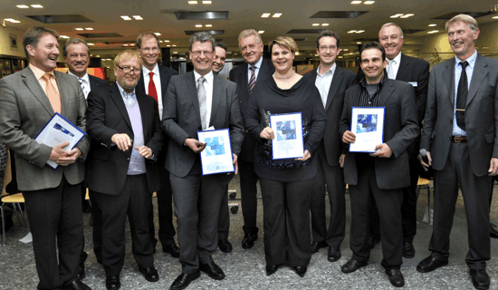 Alle Preisträger in Gruppe, rechts Professor Bornholt von der Steinbeissstifung (Jury)